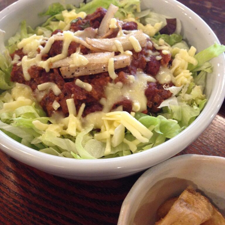 今日のまかないは…夜メニューのチリナチョスの残りを店長がアレンジしてタコライス風…を作ってくれました。シャキシャキのレタスとチーズが溶けてとってもおいしかったです。ポテトフライのオマケ付きでした。(い)