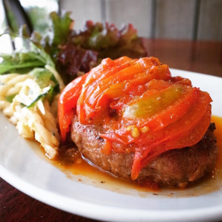 人気の夏ランチは「フレッシュトマトのハンバーグ定食」!トマト丸々一個分をいっしに焼いてのっけ盛り!そのままさっぱりソース代り!やさしいお味ですいすいたべられますよ!ぜひ!(お)