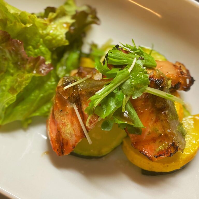 店長ミヤザキ、生まれて初めて丸ごと1尾の鮭を捌きましたよー! というわけで、生でも食べられるハーブで育ったスーパーサーモンを、レモンとニンニクでマリネして、グリルで仕上げます「サーモンのレモンマリネグリル」は、シンプルながら爽やかに美味しい、夏の鮭料理、白ワインと合わせたい〜!(麻)