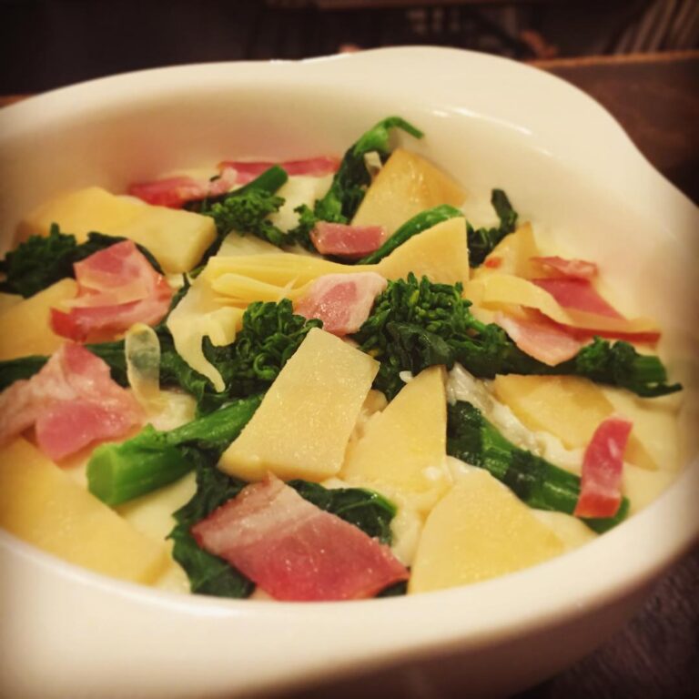 チーズをのせて焼いたら完成!あつあつ「たけのこと菜の花、ベーコンのグラタン」!いや、春の風味に旨味に食感!間違いなくおいしいね!寒い今夜はなおさらおススメ!(お)