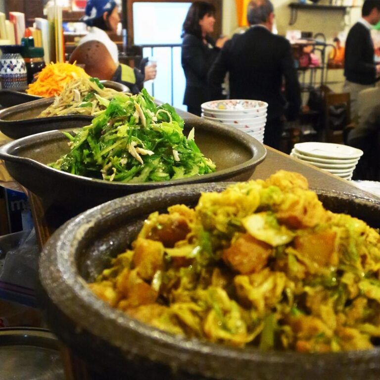 いつものお惣菜も45名のご宴会用!大きな鉢は手前から「新じゃがとキャベツのサブジ」「セロリと蒸し鶏のレモンマリネ」「ごぼうとピーマン、蒸し鶏のわさびあえ」そして「にんじんのスパイスサラダ」!さあ、わんさとたべてくださいな!(笑)(お)
