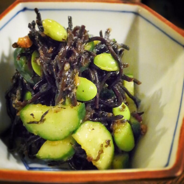 いやうちらしい地味で、でも大変滋味深い小さなサラダは「枝豆とひじきの梅サラダ」…海の旨味はひじきにシャキシャキきゅうりの食感ち枝豆は夏のおいしさ!梅干しを刻んで作った梅ドレッシングでどうぞ!(お)