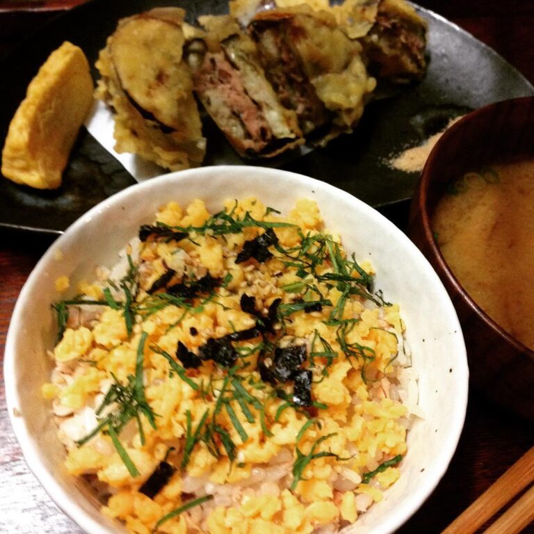 今夜は宴会のお客様のおかげ!まかないのご飯も豪華版です。シャケのちらし寿司の向こうに見えるのは、なすのはさみ揚げ。カリッとジュワッと美味しくいただいています。(ふ)