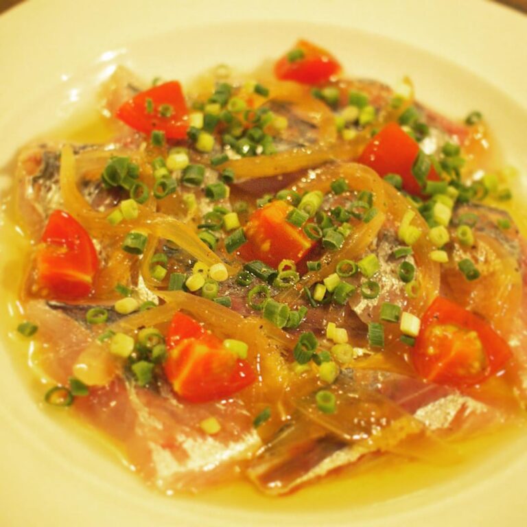 そしてアジはもう一品!久しぶりの登場ですね!「アジのマリネ」!ぴちぴちのアジにたまねぎ、トマトで彩りも添えて、白ワインビネガー仕立てのさっぱりまろやかなマリネ!まずは前菜にぜひ!(お)