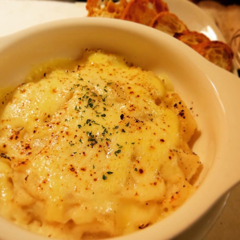 そして今夜のもうひとつのあつあつおススメ!「じゃがいもゴルゴン」!ほっくりにんにくミルク煮にしたじゃがいもに独特な風味のゴルゴンゾーラチーズを加えてチーズをのせて焼いた「じゃがいもゴルゴン」!かりかりバケットを添えて!(お)