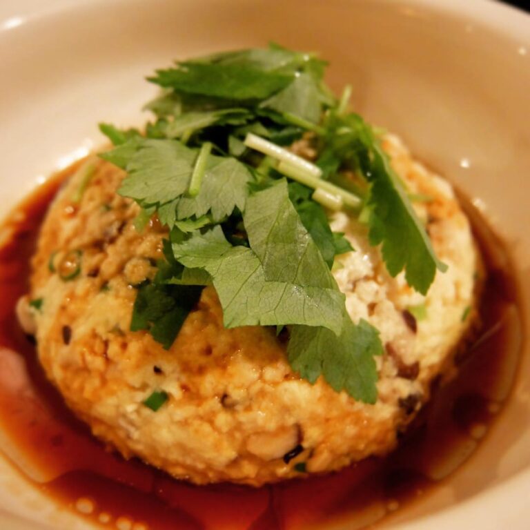 さらに今夜はこちらもあつあつ!「ホタテ入り蒸し豆腐」もおススメ!ホタテとしいたけの旨味が満点!蒸したてあつあつ、ふんわり湯気が立ち上るところにごま油の効いたしょうゆだれ!ばらりと三つ葉を散らして、くれぐれも熱々のうちにお召し上がりを!(笑)(お)