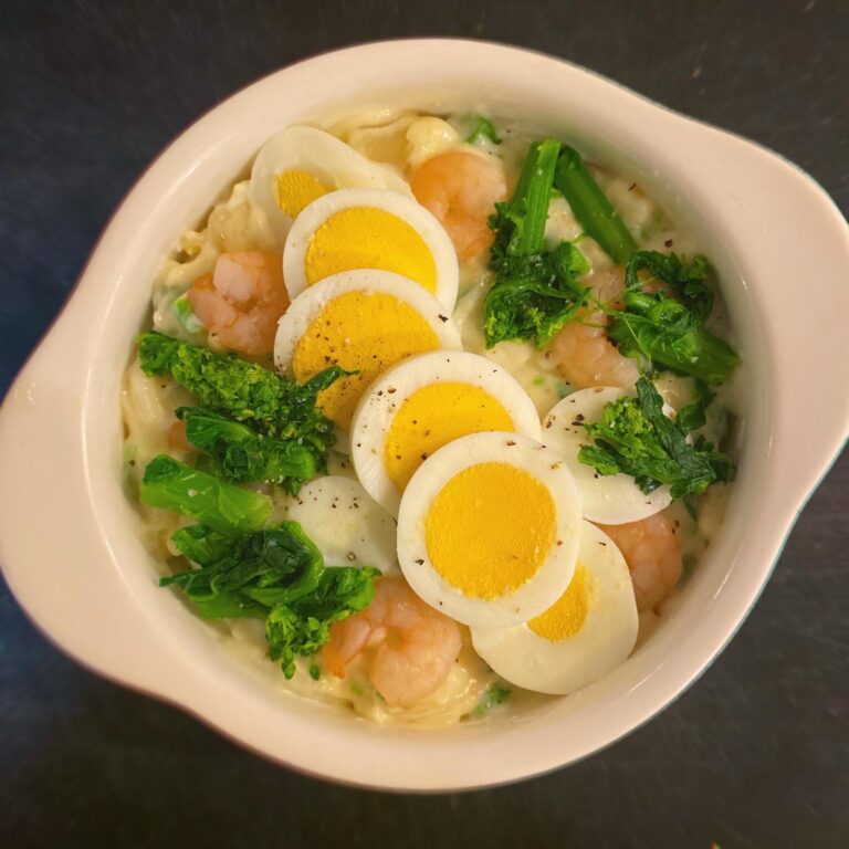 はい、先日お見せしましたグラタンの中身に、チーズを乗っけて焼きましたのがこちらでございまーす!「菜の花とエビ、茹で卵のマカロニグラタン」は、寒い夜に春を感じられるアツアツの一品です。ひねりなしで王道の美味しさ、ぜひ味わってくださいね!(麻)