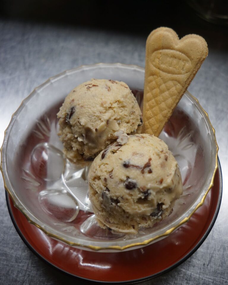 小豆みるくアイスクリーム、今年もお出ししてます。より理想を追求してリニューアル。粒が残るくらいの塩梅で茹でた小豆をミルクアイスのベースが練り上がったところに混ぜ込んで。こっくり柔らかな自家製アイスクリームと小豆の粒感を味わってくださいね〜(ぬ)