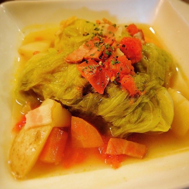 できました!具だくさんはフレッシュトマトに新じゃが、新にんじん!春キャベツのやさしい甘みに包まれた肉だんごのおいしさ!春のロールキャベツ!…肌寒い金曜の夜にはぴったりですよ!ぜひ!(お)