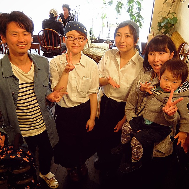 お日柄もよい日曜日、当店元ホールスタッフ、その仕事とスピードとクオリティは今や伝説的でさえありますねのホーリー!愛息子のアヤタ君と旦那さんはけんちゃんと一緒にご来店!すくすく育つ小さな家族が大変ほほえましいですねと、今日はホーリーが来るということで志願のシフト入りは愛弟子のウメさんもいっしょに、ハイ、パチリ!(お)