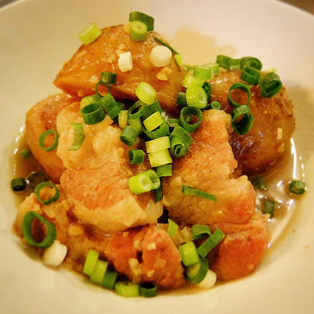 新じゃがはさっくり揚げて、豚バラ肉はじゅうっと焼き付けて…それぞれ旨味を閉じ込めてから、お味噌とバターでこっくりこっくり煮込みます、えぇ、「揚げ新じゃがと豚バラ肉のこっくり煮」…今日みたいな雨の日にはうってつけであります、ハイ。(お)