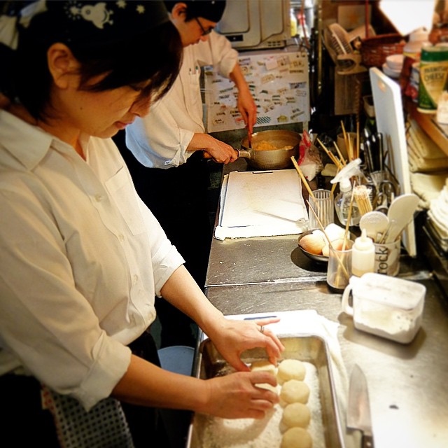 さてさて今夜のおすすめは…元スタッフヒデキんちのコロッケ!久しぶりの登場はじゃがいもと魚のタラを合わせた「じゃがたらコロッケ」!店長ミヤザキ仕込みに余念なし!…そしてその向こうではくぼさんのマーマレイド作りフタタビ!(笑)(お)