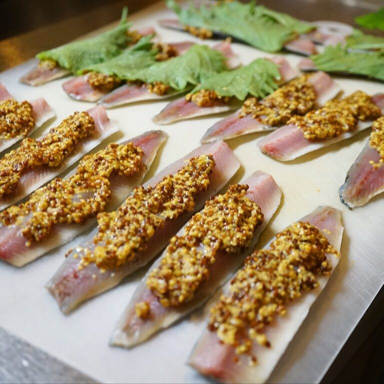 さてと今夜久しぶりに登場はワタクシも大好き!お魚フライは「いわしのマスタードフライ」!いや、市場から届いたぴかぴかいわしを三枚におろしたら、こんなにたっふりのつぶマスタードに大葉をのっけて…でもこのくらいでいわしのくさみ消しにはちょうどいいくらいよとパン粉をつけたらあつあつフライに!いや、もちろんビールのお供は第一候補ですとも!(笑)(お)