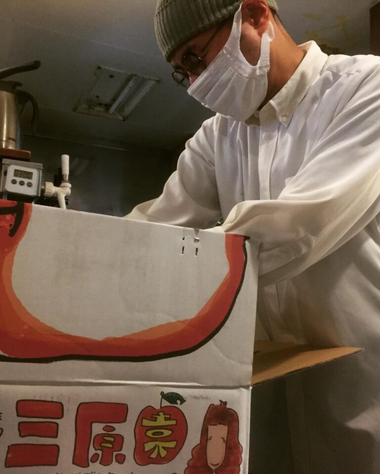 かれこれ何年前になるんでしょうか、okayanが教育実習の時の生徒さんからリンゴをいただきました。今もお付き合いがあることがとっても素敵なうえに箱がとってもかわいい!まかないの時にいただきだきました。やすこさん、ありがとうございます。とても美味しかったです。(ウメ)