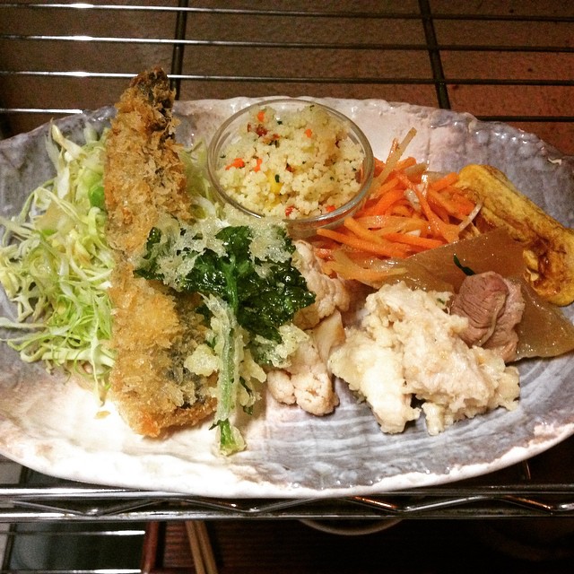 今日のまかないは 色鮮やか!なべさんが買って来てくれた、最近できたというイタリアンお惣菜屋さんのおかずも入ってますよ〜。丸皿に入ったクスクスのサラダと、右下の鳥肉のレモンマリネ、いただきます!(コジ)