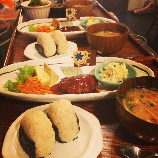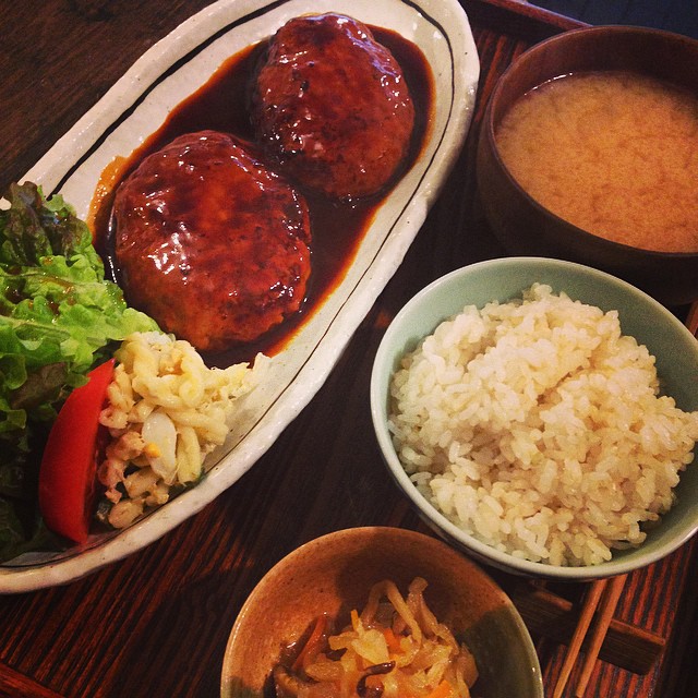 ハンバーグがどうしても、一つじゃ足りない!という育ち盛の男の子。ハンバーグ2枚焼いて乗っけて!とのリクエスト。1300円の特別ハンバーグ定食でお受けしました*(^o^)/*大きくなれよー!(麻)