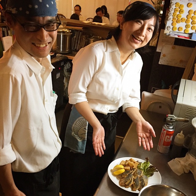 今夜は小さなご宴会をいただいておりまして、えぇ、季節のコースは秋刀魚のから揚げを盛りつけているところ…店長ミヤザキが手本見せ。(お)