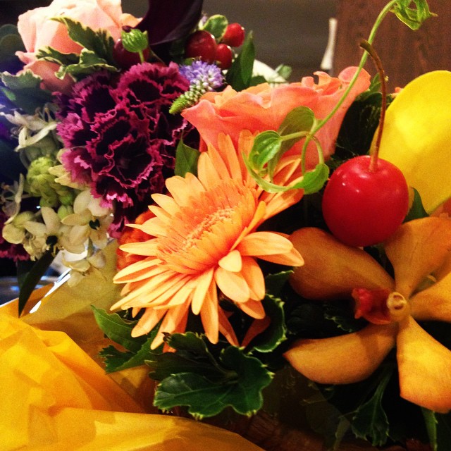 一昨日の19日、店長でツレアイのミヤザキのお誕生日、そしてワタクシドモオーナー夫婦の入籍記念日にといただいたお花。ありがとうございます。(お)