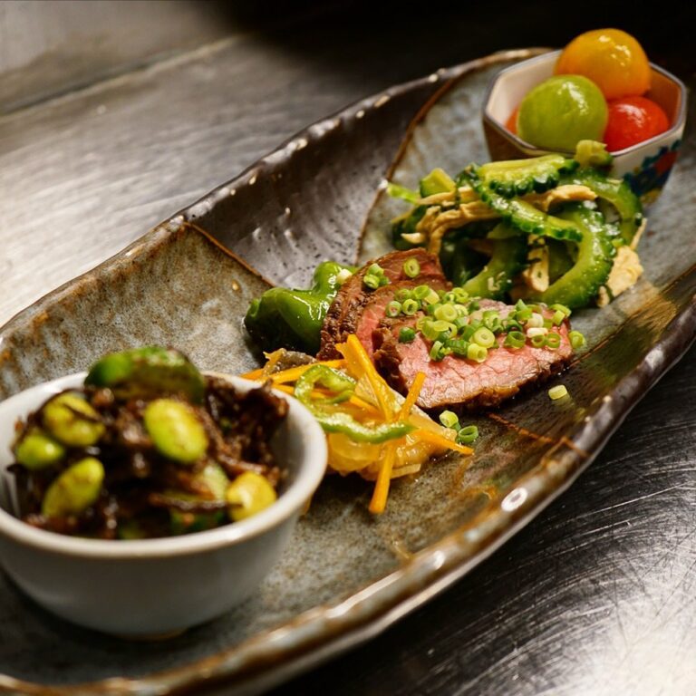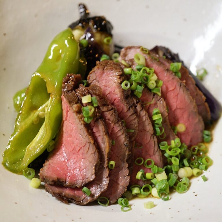 さて今週末前菜お肉メニューは「牛のたたきと揚げ茄子の柚香漬け」!じゅうっと焼き付けた牛肉のたたきは旨味いっぱい!さっと揚げした茄子をあわせて自家製柚子たれでさっぱり夏の一品ですよ!(お)