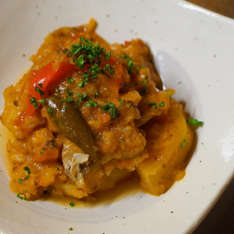 さて、ふと気づいたらまた地中海あたりのご飯まつりみたいになっております、こちらはモロッコ料理の「白身魚のタジン風」です。鱈を塩とスパイス、ニンニクなどの入ったマリネ液に漬け込んだら、玉ねぎやトマト、じゃがいもにレモンなどと一緒に蒸し煮にするのです。レモンとトマトの酸味に、複数のスパイス。複雑で旨味の絡まり合う味わいは、他に似たものがないような気がします。ワインでいっぱいやりたいなあ!(麻)