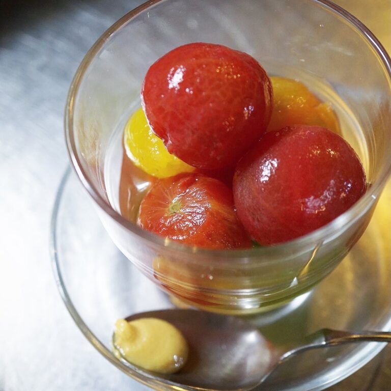 色とりどりのミニトマトはさっと湯通しして皮をむいたら、やさしいお味のお出汁に漬けて「ミニトマトのおひたし」。ひんやり小さな旬のメニューは夏の宝石箱のような一品!さっと前菜にぜひ!(お)