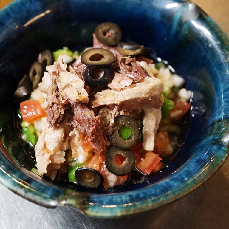 自家製ツナのサラダ新作はスペイン風の「ピカディーリョ」!まずは低温のオイルでじっくり煮た自家製ツナがとにかく旨い!と(笑)、そこに角切りにしたトマトやピーマンたまねぎなどなどあわせたら、もちろん黒オリーブがアクセント!夏にうってつけのサラダですな!ぜひ!(お)