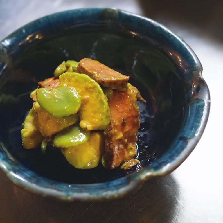 しっとり大人の新メニュー! 「アボカドとそら豆・牛肉の柚子胡椒あえ」です。柔らかな赤身の牛うちもも肉を炙って、個性的な香りの空豆と、ねっとり食感のアボカドと合わせ、柚子胡椒とオリーブオイルベースの和え物にしました。旨味の対決かと思いきや、柚子胡椒とオリーブオイルが皆をつないで、良い感じのチームワークが生まれております。日本酒にもワインにもいけます、ぜひぜひ。(麻)