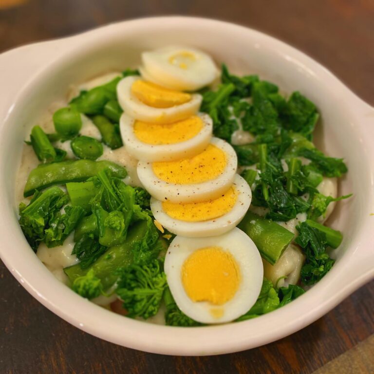 今週はグラダンをお出ししていきますよ!「新じゃがと春野菜のグラタン」です。沖ノ島産の新じゃが出始めたら、新じゃがの食べどき。ベーコンの旨味の溶け出したホワイトソースで煮た新じゃがに、さとうざやと菜花、茹で卵をのっけました。これにチーズをのっけて、あとは焼くだけ! 春のグラタン、あなたのお越しをお待ちしておりますよ♪(麻)