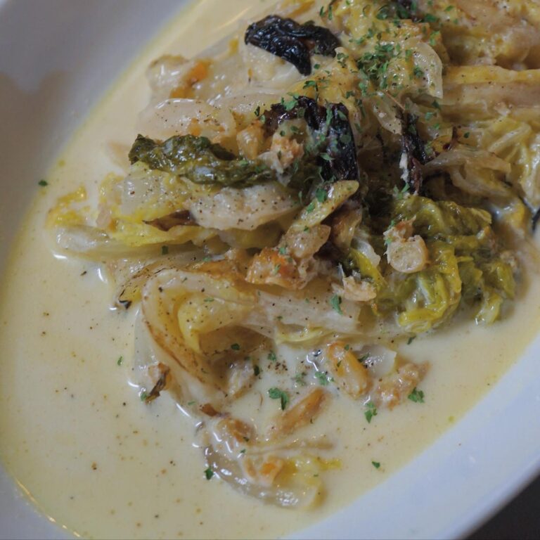 白菜のクリーム煮は、くったりした白菜が干しエビの旨味とクリームのこっくり感で、やさしく体を内側からあっためますよー!一度オリーブオイルで焼き付けて香ばしさを出してから煮込んでおります。干しエビは山口産の上物ですよ!ご飯にかけたいという意見も多数…(麻)