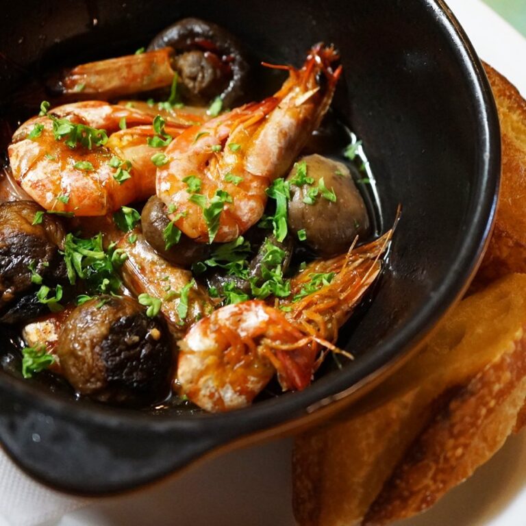 さてと五輪も開幕して土曜日…ぷりぷりおつまみは「えびときのこののアヒージョ」!殻付きエビの旨味!きのこと合わせたらにんにくの風味いっぱいオリーブオイルで煮たアヒージョ!バケットを添えて(お)