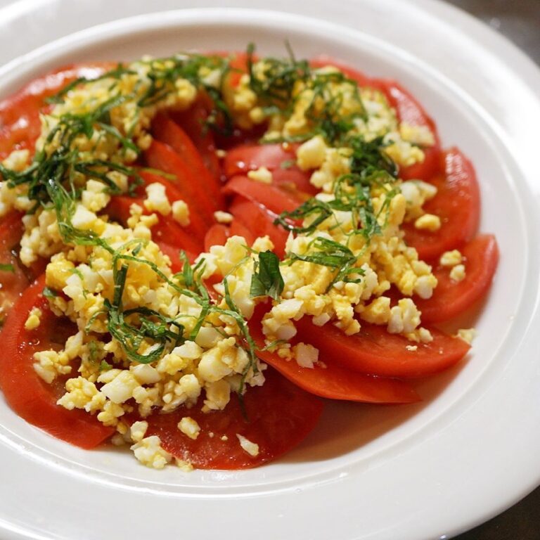スライスした旬のトマトのシンプルなおいしさはやさしいお味の自家製こんぶ茶ドレッシング!みじん切りにした玉子と大葉をちらして目にもおいしいサラダですよ!(お)