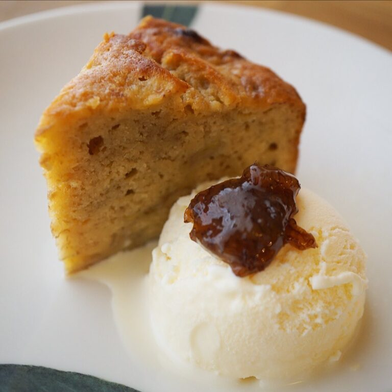 さてと週明け季節のデザートは「バナナのケーキ(バニラアイス添え)」!しっとりたっぷりバナナのおいしさのバナナケーキにひんやりバニラアイス、さらに手作りのバナナジャムを添えて…バナナづくしの一品であります!(笑)(お)