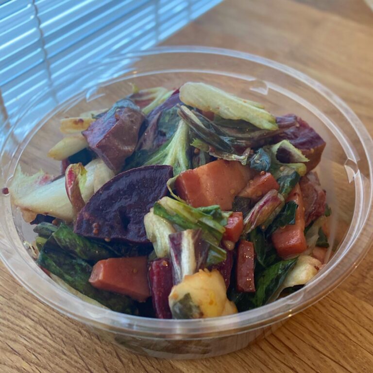 高知・森田農園さんに送っていただいているお野菜便の中から、トレビスと紫芋を使って、「トレビスと紫芋・ベーコンのマリネ」を新メニューで作ってみました。爽やかな苦味が特徴のトレビス、それだけでは苦いなあと、甘みのある紫芋と旨味の強いベーコンを合わせて、バルサミコと醤油、粒マスタードとオリーブオイルでマリネしてみたら、モードな感じの色味で、味もバランスよく仕上がりました。栄養たっぷり、ぜひ梅雨の体力づくりにも!(麻)
