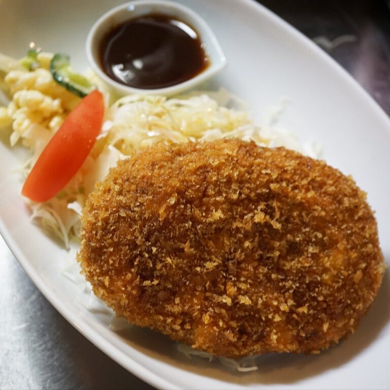 ざっくり大きなメンチカツ!あつあつジューシー!中にはふかした甘いとうもろこしがざくざく入って、これぞ夏のメンチカツっ!早くビール〜!(まだお預け…苦笑)(お)