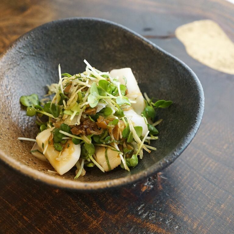 出たよ、店長ミヤザキの思いつき新メニュー!「アオリイカの青梅醤油あえ」です。okayanの弟、釣りキチあっちゃんが釣って送ってくれたアオリイカは、肉厚でムッチムチの美味しさ。これを家の近所の地主さんが軒先で売っていた青梅を潰して割って醤油につけておいた自家製青梅醤油と香味野菜と一緒に和物にしました。素材の良さをそのままシンプルに生かした、この季節にぴったりの爽やかな酸味のメニューです。あるだけ売り切れ御免!(麻)