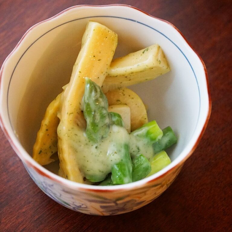 さらに前菜春の味覚は「たけのことアスパラの木の芽あえ」!シャキシャキたけのこにぷりぷりアスパラは風味のよい旨口自家製山椒味噌でしっとりとあえて、いや、そろそろたべ納めの季節ですかね〜(お)