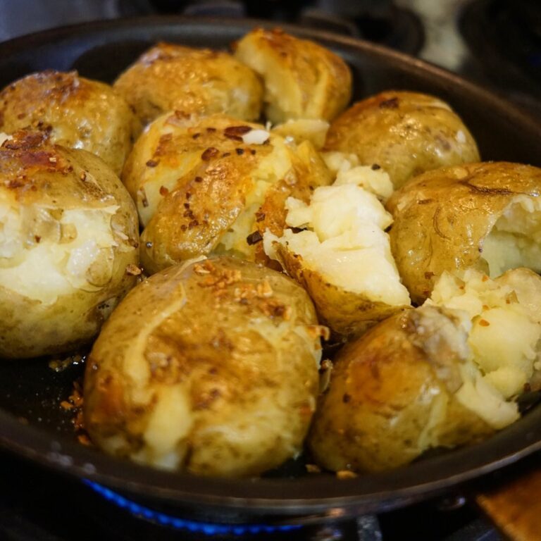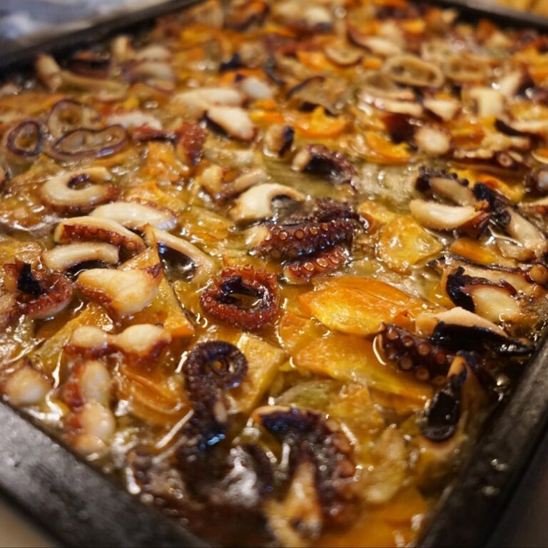 一度蒸して叩きつけた皮ごと丸ままじゃがいもは、にんにくとオリーブオイルでさらに焼いて風味に香りをつけていきますよ!と、こっちも「バレンタインちょこもり」は「タコとじゃがいも、香味野菜のグリル」の下ごしらえであります!明日楽しみだねー!(お)