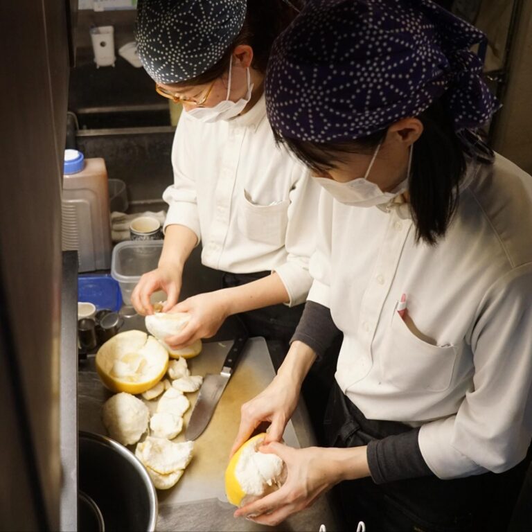 元キッチンスタッフは高知の久保さんから今年も文旦がわんさと届いたよ!とさっそく昨夜からそのみずみずしい果肉てさっぱり「文旦と香味野菜のサラダ」がメニューイン! 午後はぬまっちにウメさん2人がかり、ムッキーちゃんを使ってせっせとむいてもらいました!今夜のサラダはこれで決まりっ!(お)