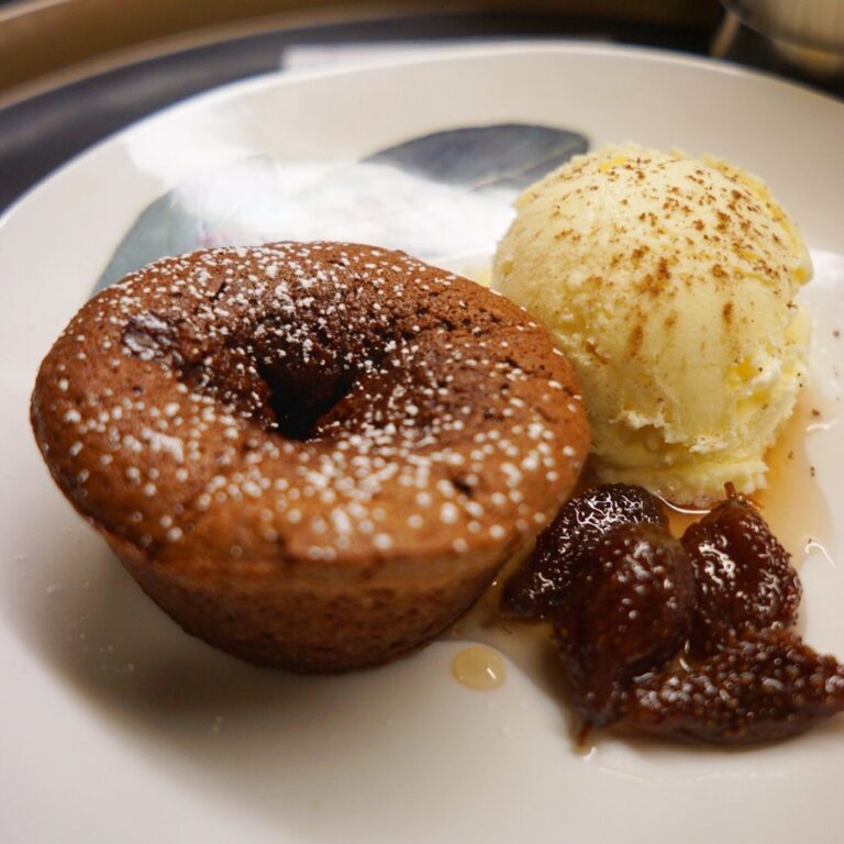 さてとはじまりましたよ!季節のデザート「フォンダンショコラ」!あつあつとろりのチョコレートケーキにひんやりバニラアイス、さらにラム酒に漬けてたいちごで作った大人風味のジャムを添えて!一応店内飲食のみでお願いします!(お)