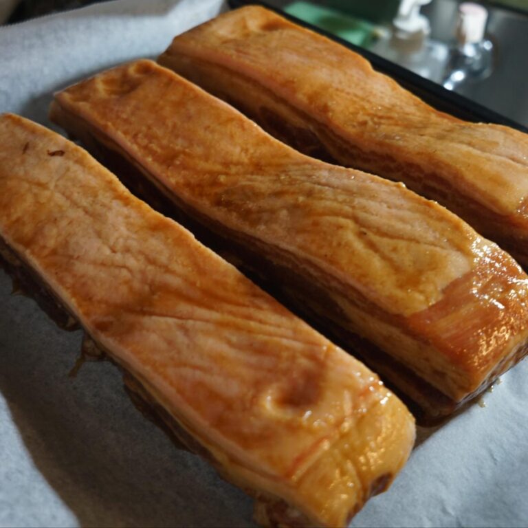 さてと昨夜閉店後は店長ミヤザキ、一晩たれに漬けておいた豚カタマリ肉!レンジでじっくりグリルしただけであまりにおいしそうで、スタッフ一同から歓声が上がるほど!(笑)仕上げに水飴を表面に塗って照りをつけたらまた寝かして…今夜の新メニューは「からし焼き豚」!ワタクシもたべたいっ!(笑)(お)