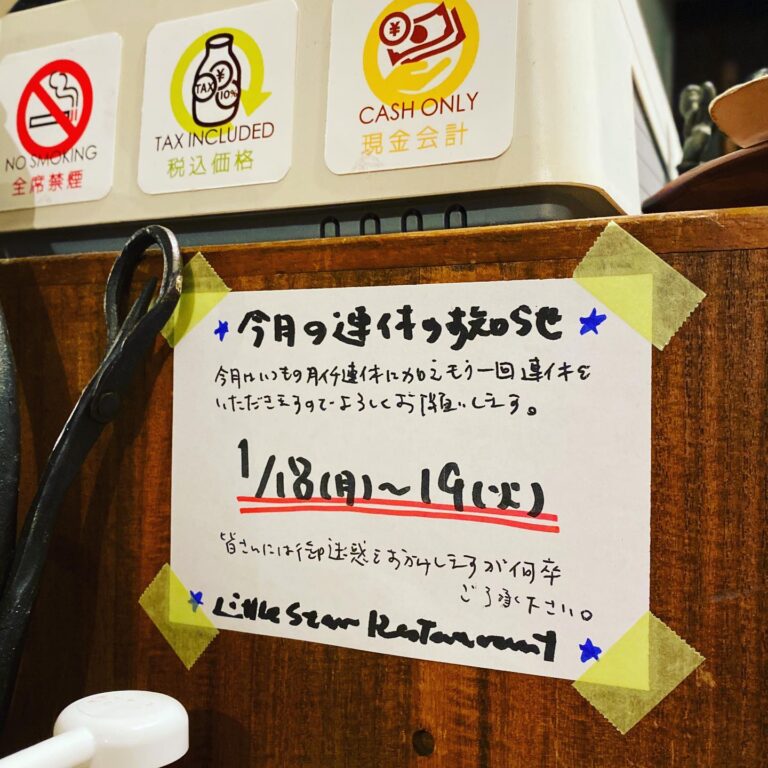 あー、火曜日ですけど連休ですよー…今週は明日水曜から営業です、よろしくお願いします〜(お)