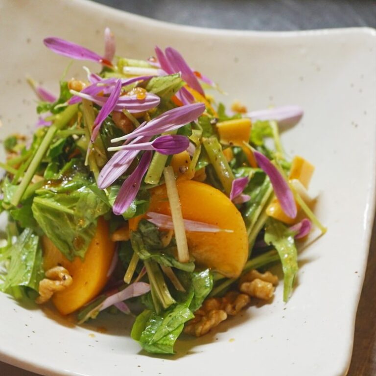 今週も始まってますよ、夜のリトスタ! 秋の新作サラダは「柿とチーズ、香味野菜のサラダ」です。上品な甘みの柿はサラダにしても素敵な素材。コクのあるハードタイプのチーズとクルミをポイントにして、クレソンやルッコラ、水菜や菊などの香味野菜と合わせて、さっぱりとしたこんぶ茶ドレッシングで仕上げました。 白ワインに合わせても、きれい系の日本酒にもグッとくるかと思います。秋の夜長を楽しめるサラダですよー(麻)