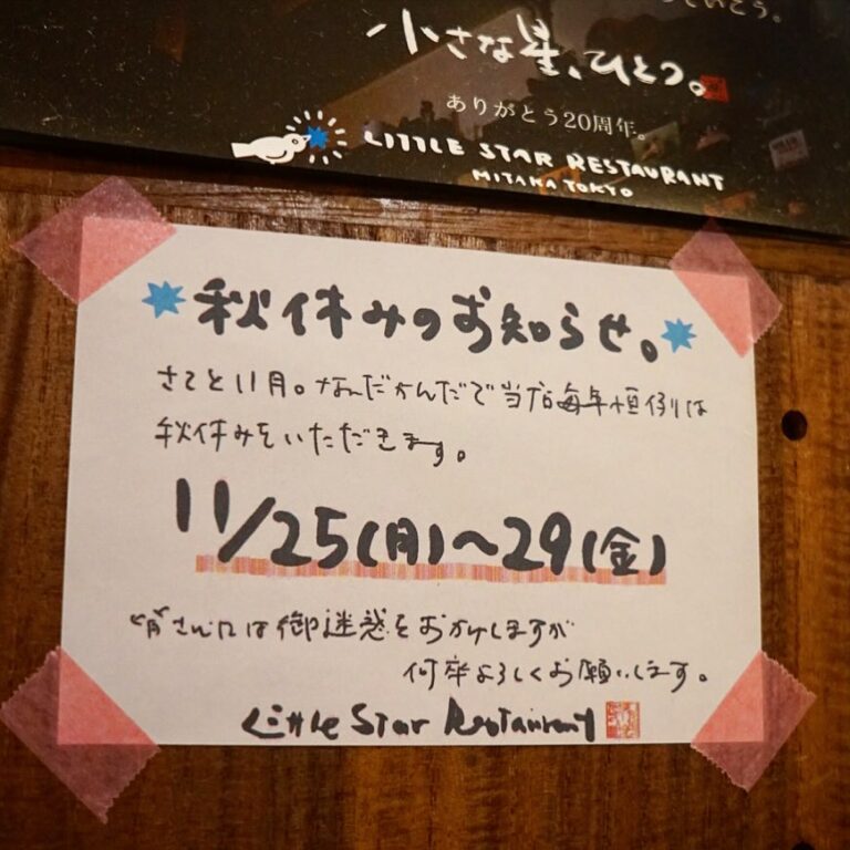 さてと11月は最後の方で恒例の秋休みをいただきます!…ワタクシドモオーナー夫婦的には年末までしっかり走り切れるようにあれこれ準備をしたりで、どこか旅行ってこともなく(苦笑)、ま、それでも少しは体も気持ちも休めたらいいなぁくらいで考えております…みなさんには毎度ご迷惑をおかけしますが、何卒よろしくお願いします〜★(お)