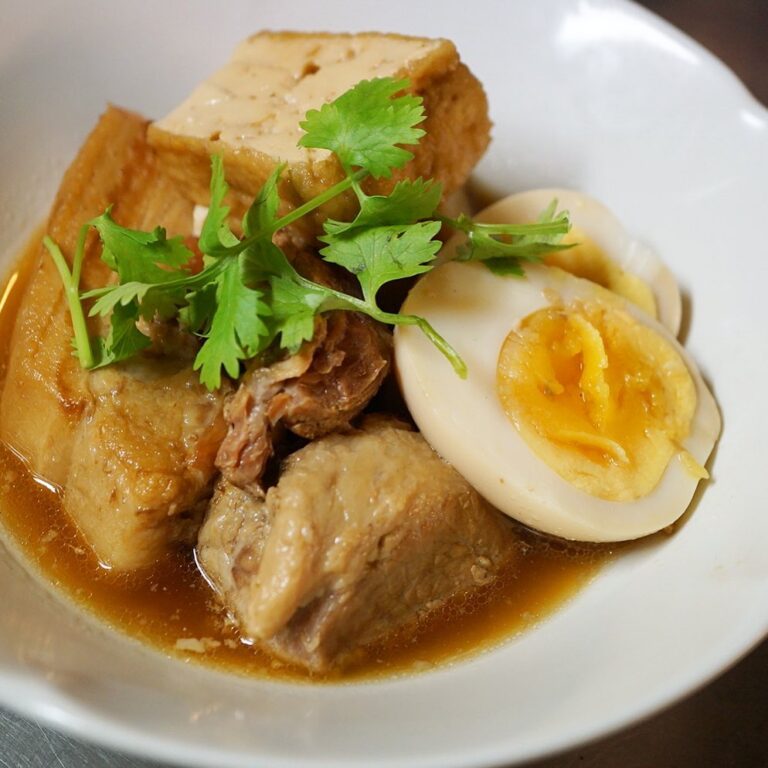 やっぱりカタマリお肉をじゅうっと焼くのはイイネ!と(笑)こんがり焼き目をつけて旨味を閉じ込めたら、アクを取りつつ下茹ではシナモン棒が隠し味…味付け甘辛はお砂糖にナムプラー、醤油ににんにくも入れて、ざっくり厚揚げをあわせて煮込んだらベトナム風角煮の出来上がりっ!もちろん半熟玉子を添えて!ぜひっ!(お)