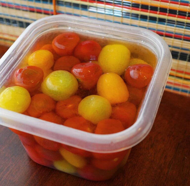 カラフルなミニトマトがあると、作りたくなっちゃうんだな、ミニトマトのおひたし。湯むきしたミニトマトはプリプリのツルんとしていて、ひんやり出汁の味が染みて、体の中がスッキリする感じがします。おニューのスダレのカラフルさとよく合ってます!(麻)