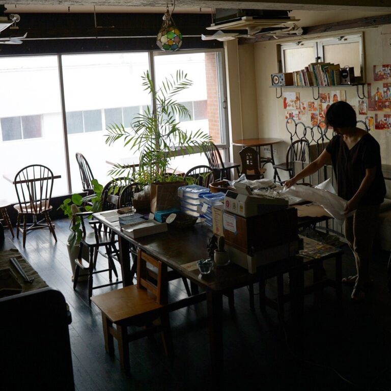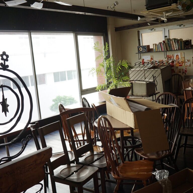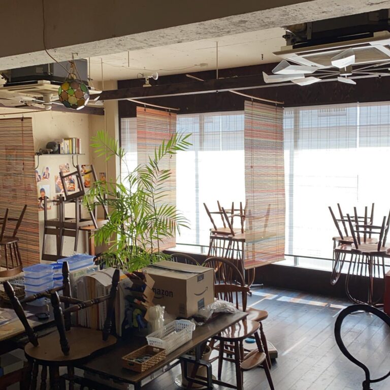 窓際にテーブルと席、レジはお店奥から前へ(お)