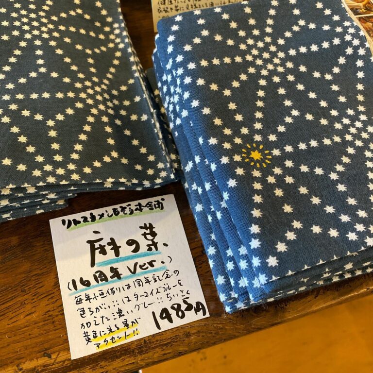 今年も、ともぞう本舗さんによる16周年記念オリジナルてぬぐい、できてます! 今年のカラーはターコイズブルーを加えた濃いグレー。この色々ある暗さも感じさせる世の中だけど、キラリと光る希望を胸に…黄色く光る星をひとつだけ。 ぜひぜひ、おひとつ。(麻)