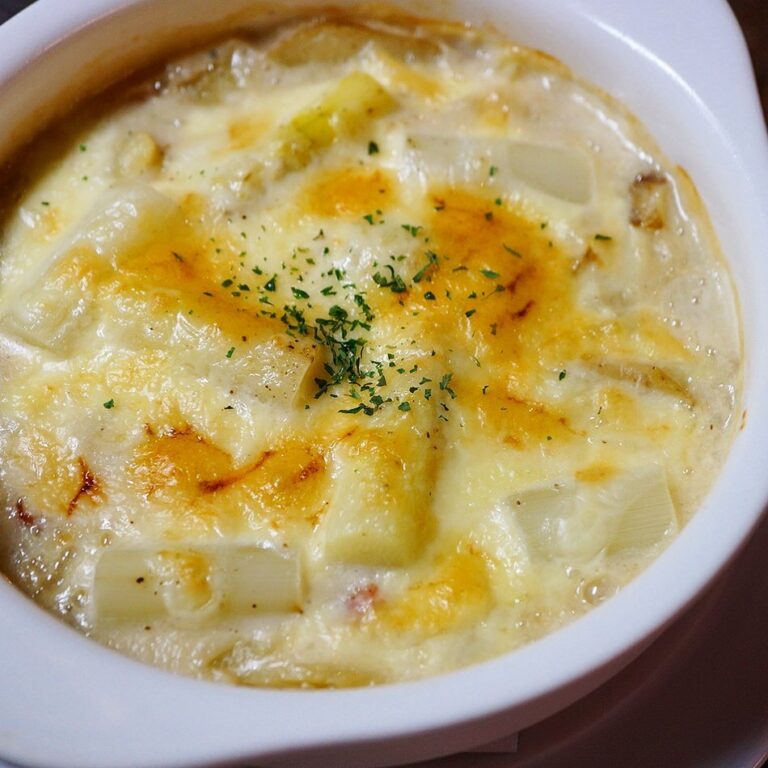 あつあつメニューは「ホワイトアスパラと新じゃがのゴルゴン焼き」!ぷりぷりアスパラとほくほく新じゃがのおいしさ!ベーコンの旨味と塩味がアクセント!ゴルゴンゾーラチーズととろけるチーズを合わせてこんがりチーズ焼き!(お)