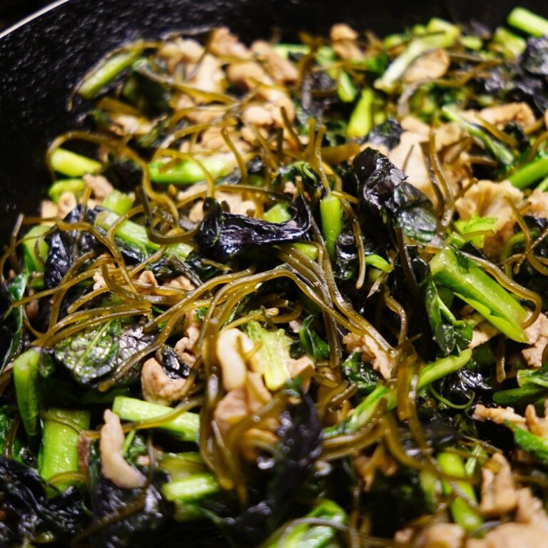 今夜のお通しはこれまた町中華にぴったり!?「高菜と昆布と豚肉の炒めもの」!お店近くは週末出店の三鷹の農家さんの高菜は大人風味のの苦味!さくさく細切り昆布と豚肉の旨味!じゃじゃっと炒めてビールにイイネ!(笑)(お)