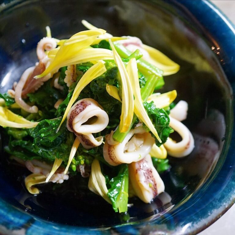 さてと金曜!今夜の新メニューは「ヒイカと菜花のだいだいぽん酢」!いや、ヒイカのぷりぷりおいしさに菜花のほろ苦、高知森田農園直送のだいだいをたっぷり絞った自家製ぽん酢がなんともやさしいさわやかさ!こりゃいいね!おいしいね!(お)